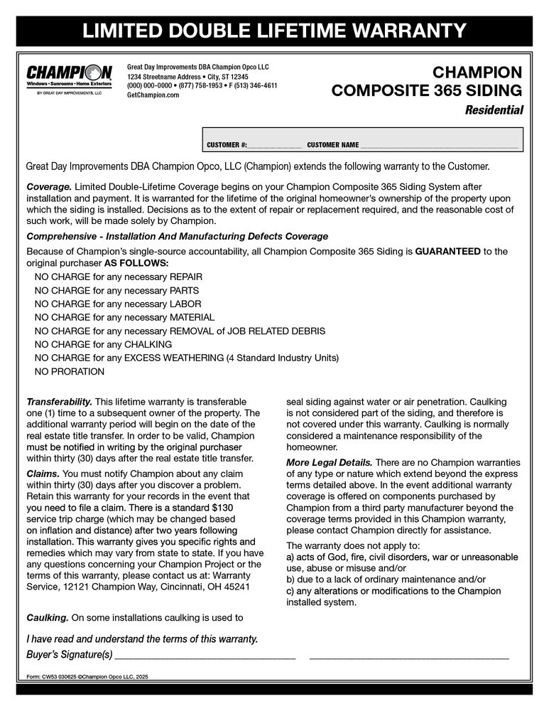 2 part Composite 365 siding warranty, sold in packs of 500.